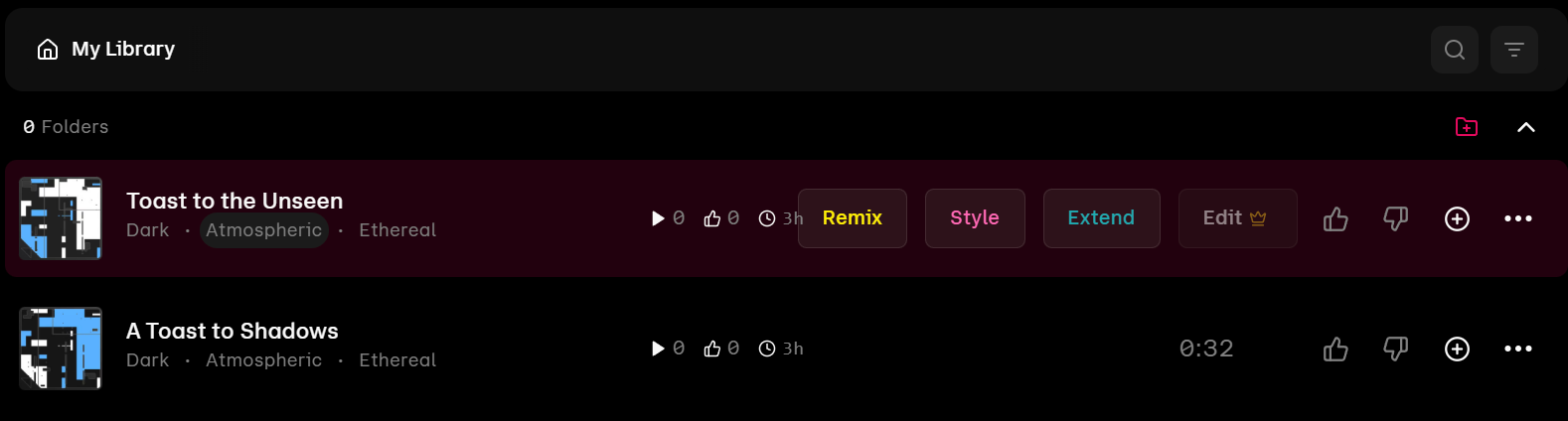 - 확장(Extend): 처음에는 약 30초 길이의 곡 두 가지 버전이 생성되는데, 이 곡들을 기반으로 인트로, 아웃트로, 벌스, 코러스 등 새로운 파트를 추가해 최대 15분까지 곡을 길게 확장할 수 있습니다.