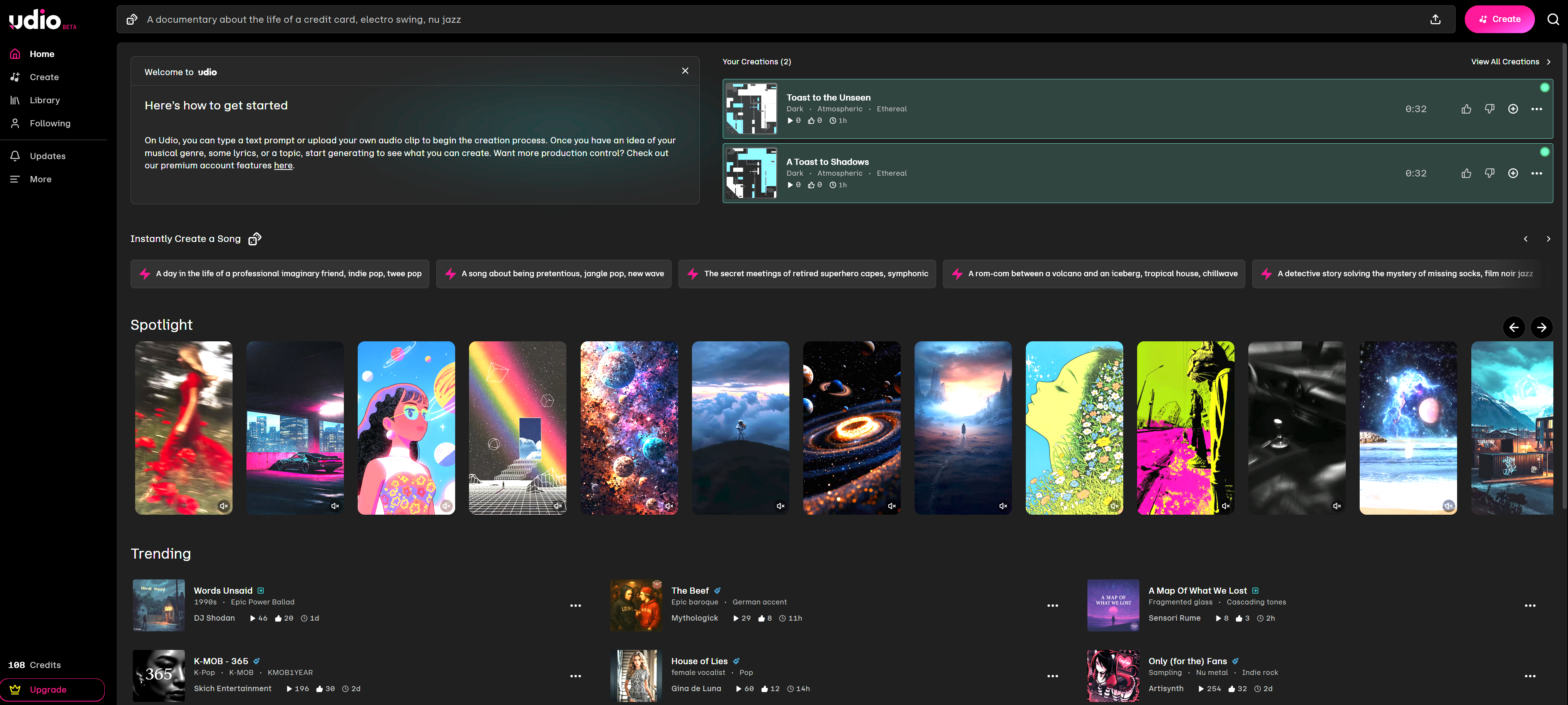 가입이 완료되면 Udio의 메인 대시보드로 이동합니다. 여기서 다른 사용자들이 만든 인기 있는 곡(Staff Picks, Top Tracks)들을 감상하거나 바로 자신만의 음악 만들기를 시작할 수 있습니다.